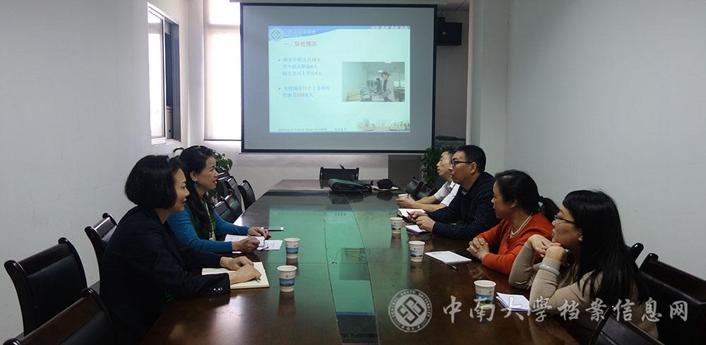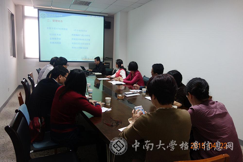 [简讯]5月12日上午,湖南师范大学档案馆馆长李彦、副馆长田支斌一行四人来我馆考察交流。我校档案馆周新宏副馆长主持交流会,汪瑞芳副馆长介绍了我校档案工作的基本情况,我校档案技术研究所常务副所长、档案馆综合技术部主任向禹详细介绍我校档案信息化建设情况,就最新改版的档案信息网和新版数字档案馆公共服务平台进行了演示。? 双方就档案的部门立卷、规范整理及利用、信息化建设、库房管理等诸多问题展开了探讨...