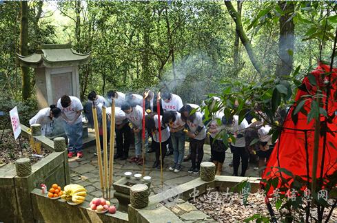 齐将军的墓在我校云麓山庄东面的岳麓山上,徒步经云麓山庄后面至登山口,右行约500米即到。笔者一行到达墓前,巧遇民革长沙市委青年工作委员会在主委黄惟的带领下,组织年轻党员进行祭扫活动现场布置。布置妥当后,笔者一行与民革长沙市委青年工作委员会的年轻党员们一起,向齐将军的墓进行了一番正规程序的祭扫和鲜花的敬献。