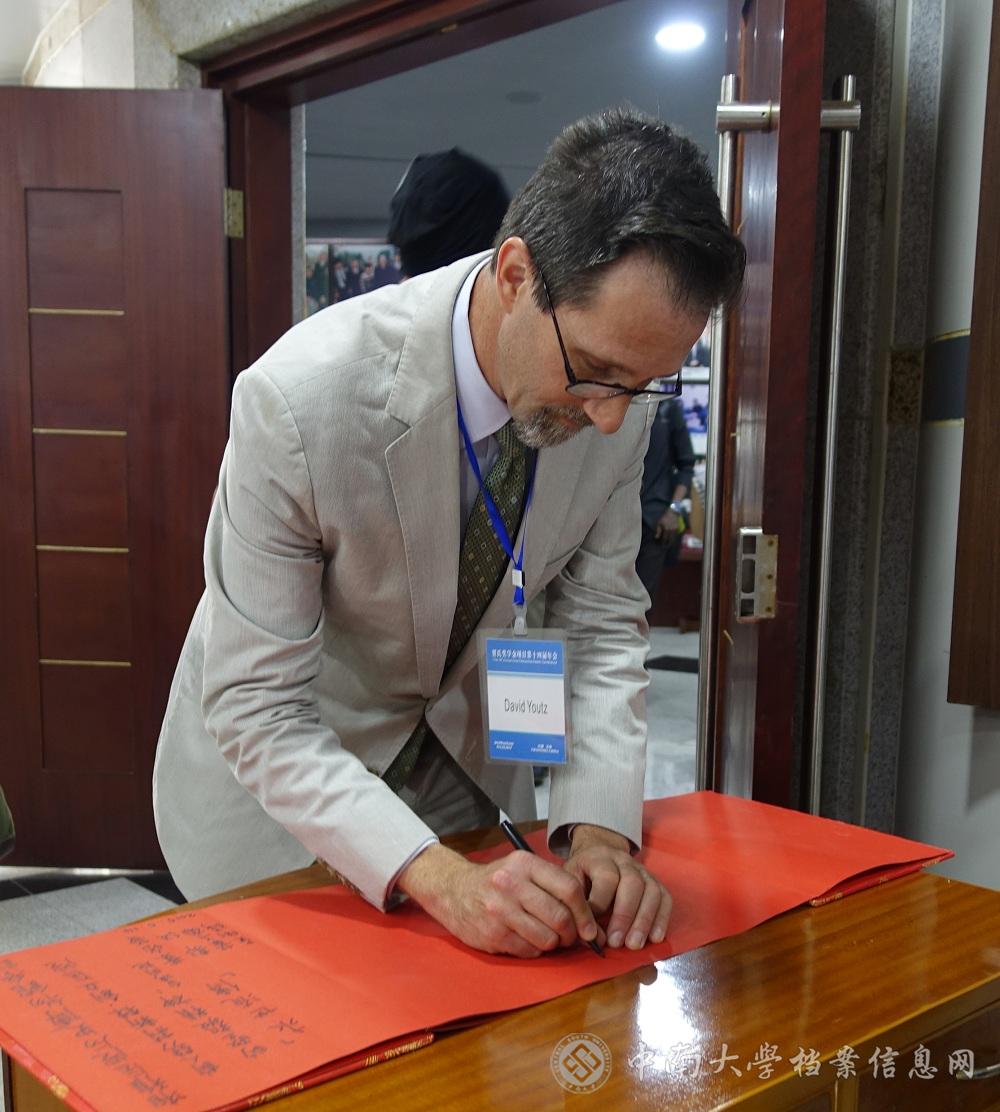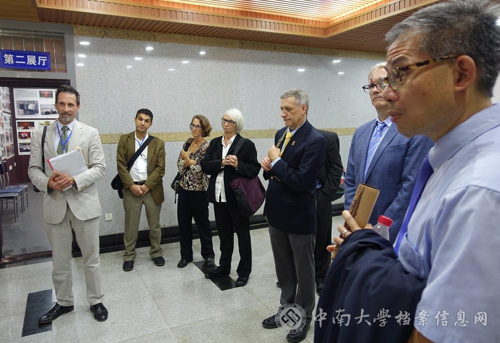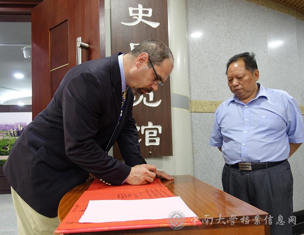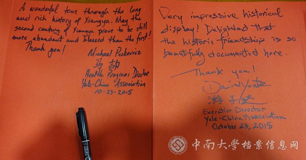 10月23日下午,雅礼协会代表团在新任会长游子达(David Youtz)先生的带领下参观湘雅医学院院史展览馆。中南大学档案馆校史研究室的副研究员黄珊琦、李君奉命接待了来访的客人。宾主就馆内陈列的内容进行了友好的交流。来宾在展览馆内合影留念。参观结束时,雅礼协会新任会长游子达先生,卫生项目组负责官员马劼(MichaelPickvicz)先生特意为展览馆留言(撰稿湘雅山人摄影老五)。