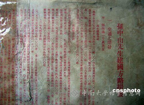 一张民国时期的孙中山建国方略图2006年11月10日现身长沙。该图以翔实的资料全面介绍了辛亥革命胜利后孙中山的建国方略,见证了他立志建设强大中国的伟大构想。该图正面为彩绘的当时中国全图。