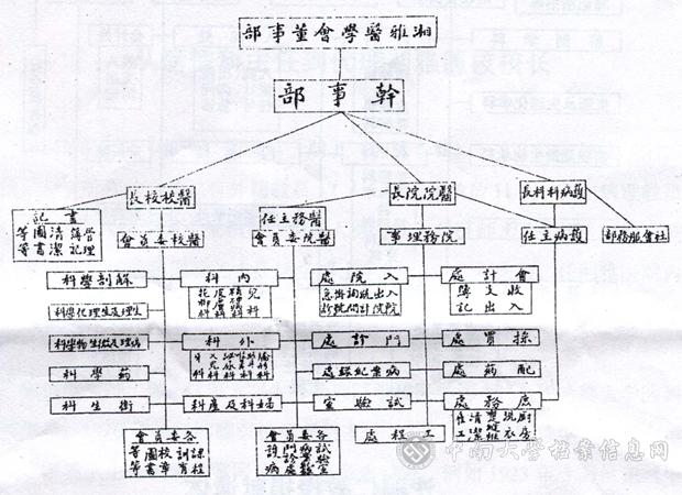 从组织表中可以看出,医校和医院是一个整体,都在湘雅医学会董事部领导之下。病理