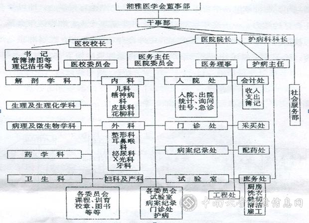 在1996年出版《湘雅医院》一书中,有关湘雅医学校、湘雅医院和湘雅护士学校的相互关系,就这样写道:“实际上,“湘雅”三个单位都是在湘雅医学会的统一管理之下,彼此紧密联系,有一支共同的教师队五。湘雅医学校负责对学生的管理、招生、分配,承担前五年的教学,湘雅医院则承担了医学生在校后两年的临床教学、生产实习,许多人既是医学校的教师,又是医院的临床医生。护校的教师则由医学校和医院人员承担,湘雅医院便是这两所学校的教学、实习医院。它们互为依存,医院附属于学校,医院附设护校。在社会上,它们又彼此独立,各自为独立的实体[11]”。在讲述上述湘雅历史的同时,又刊登了当时湘雅的组织机构表,该表与上述1924年《湘雅》杂志上的组织表是一致的,但按现行从左到右的书写方式,现将其表复印如下。